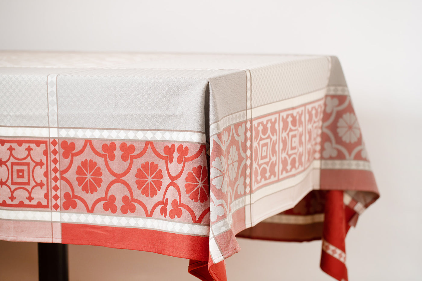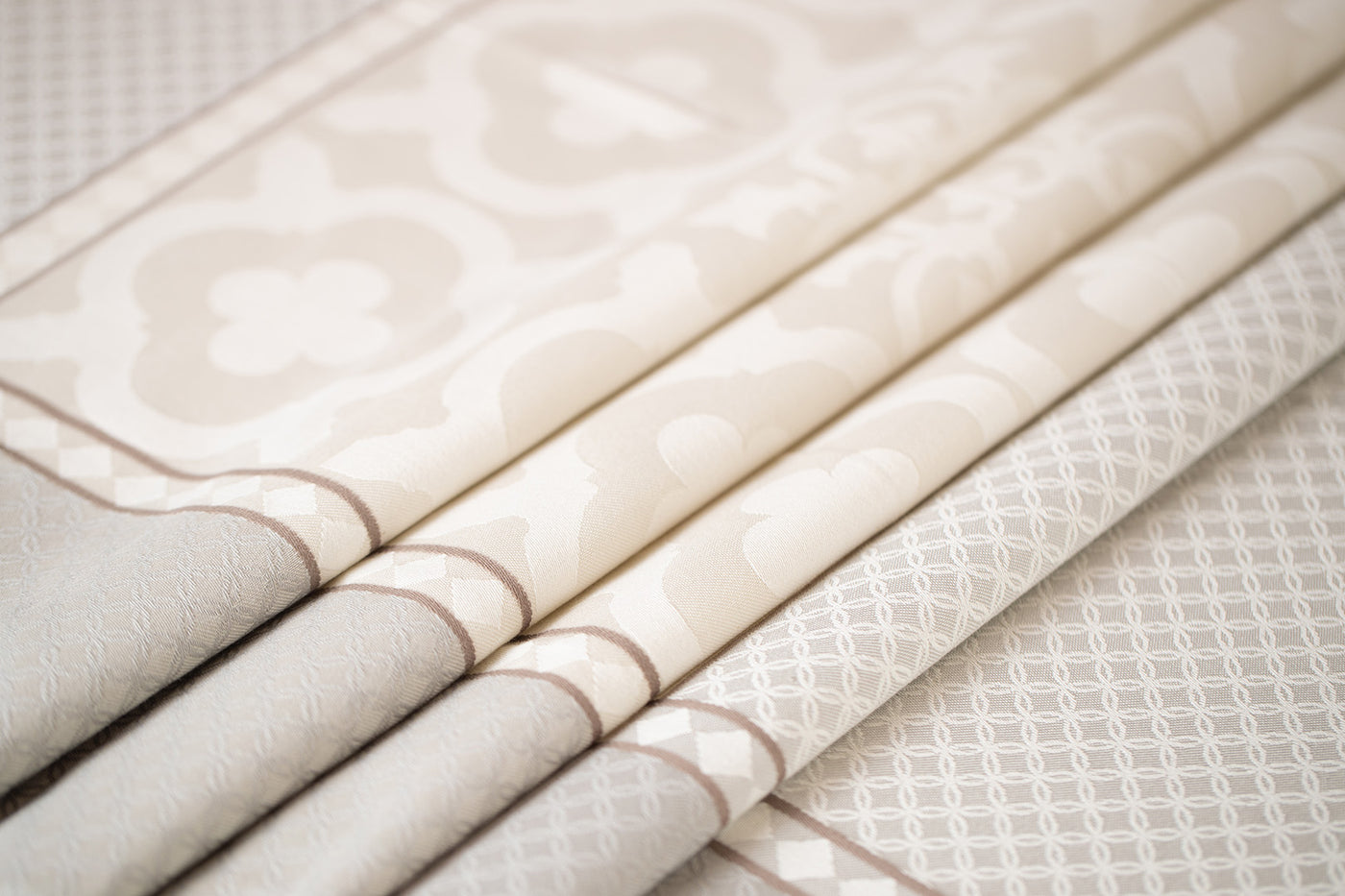 모노그램과 격자 무늬가 믹스된, 모던한 인상의 식탁보.