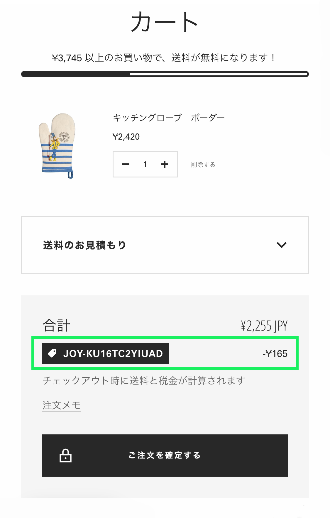 カートに入っている商品画面に、こちらのポイント(クーポンコード)が表示されたのを確認後、ご注文を確定するをクリック