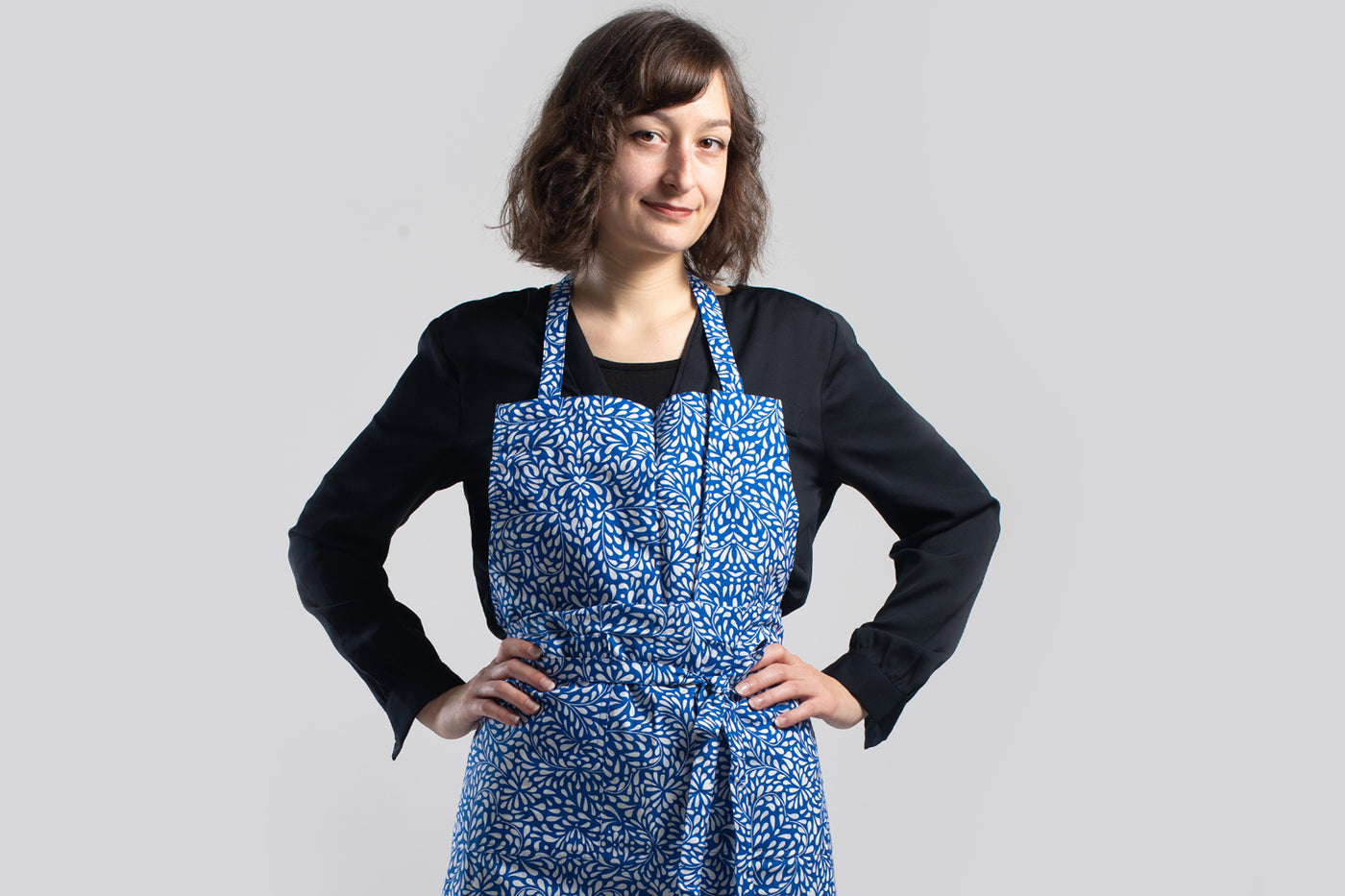 ハートと、葉っぱのようなしずく型がモチーフのエプロン。