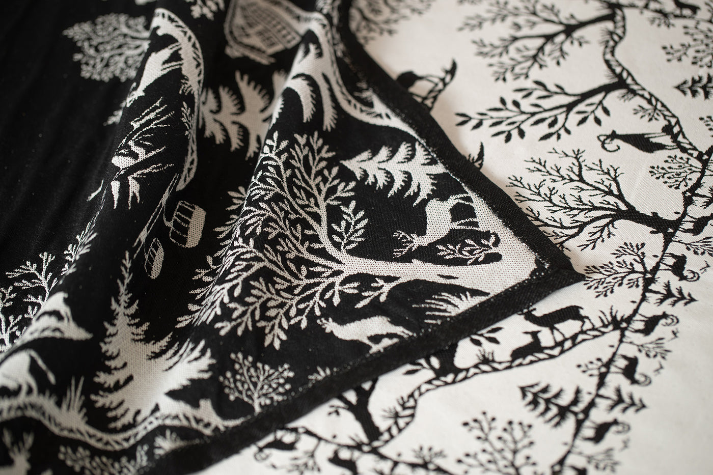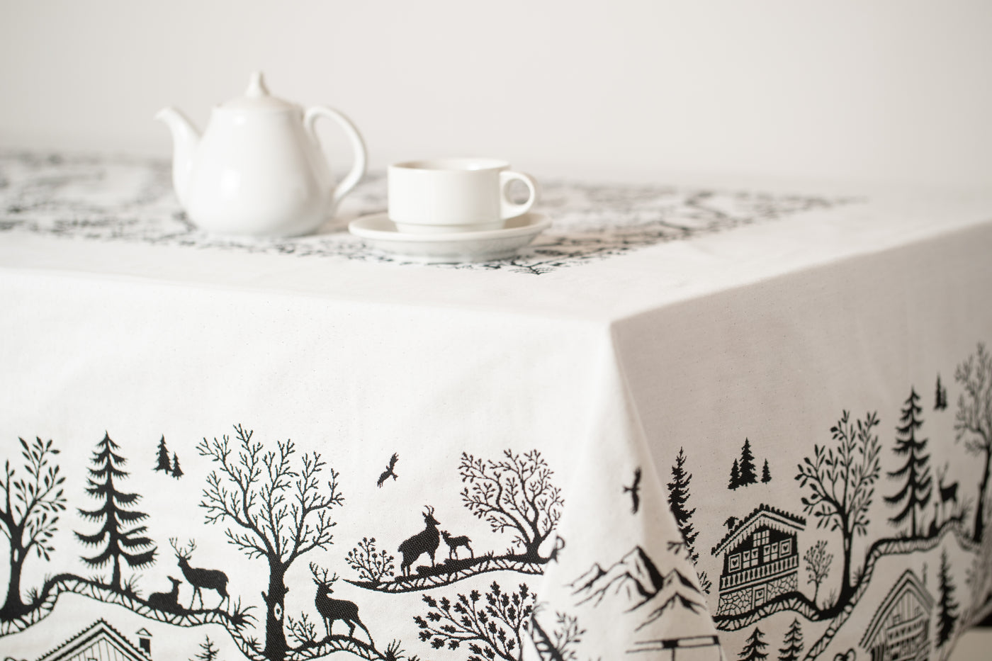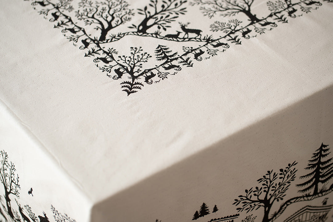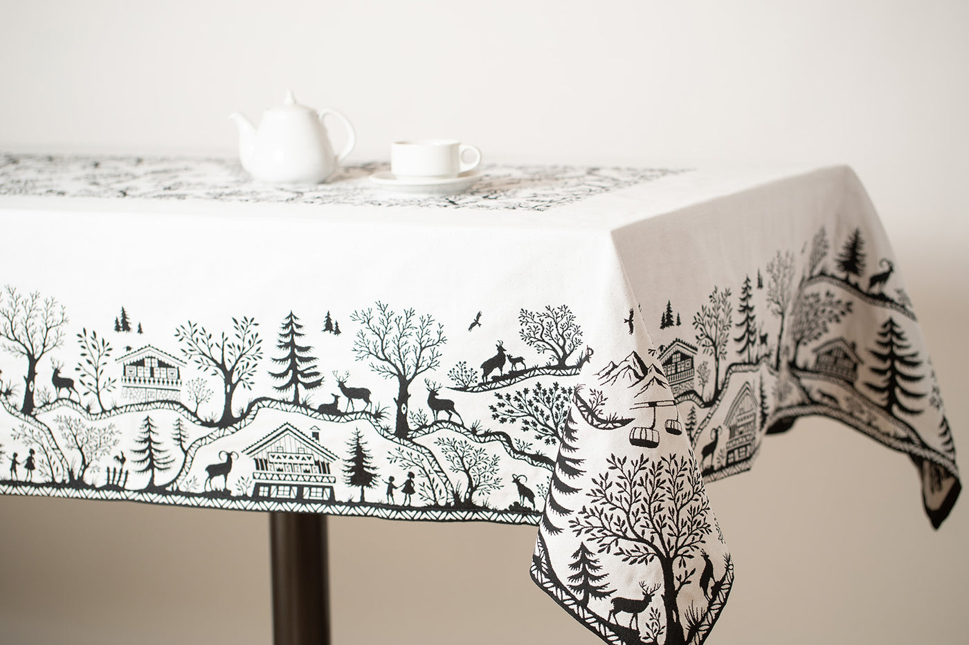 動物やもみの木、山小屋などが描かれたあたたかみのあるデザインのテーブルクロス。